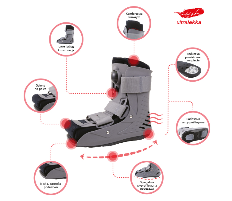 Stanowi doskonałą alternatywę do tradycyjnego unieruchomienia gipsowego, zdecydowanie poprawiając komfort użytkowania. Dzięki zintegrowanej pompce gwarantuje dostosowanie kompresji do stanu chorobowego pacjenta, redukując możliwość wystąpienia krwiaków oraz obrzęków. Gwarantuje możliwość regularnej oceny wizualnej kontuzji oraz utrzymanie kończyny w należytym stanie higienicznym. Dzięki ultra lekkiej konstrukcji Walker Pro nie obciąża kończyny, a zastosowana miękka wyściółka pneumatyczna gwarantuje wysoki komfort użytkowania.