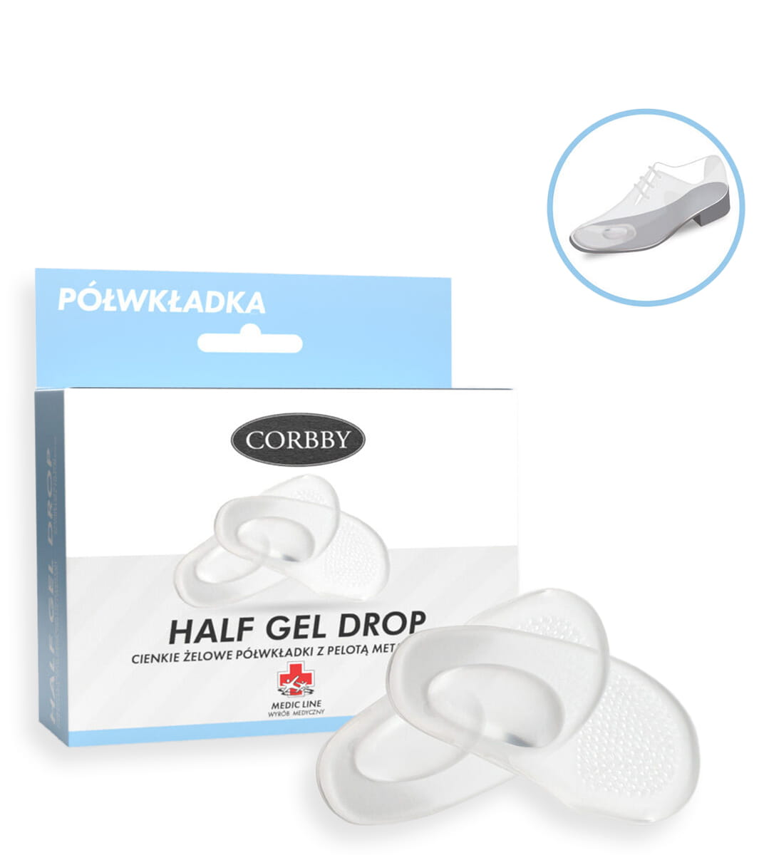 Półwkładka żelowa z pelotą metatarsalną – Cienkie żelowe półwkładki z pelotą metatarsalną, które zapewniają wsparcie dla wysklepienia poprzecznego stóp. Idealne do obuwia na wysokim obcasie, pomagają złagodzić bóle i poprawić komfort chodzenia.