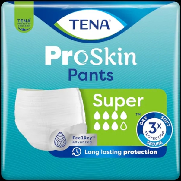 Majtki chłonne TENA Pants ProSkin Super oferują do 100% zabezpieczenia w średnim i ciężkim stopniu nietrzymania moczu, zapewniając szybką chłonność i długotrwałe uczucie suchości w ciągu dnia i nocy.