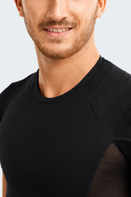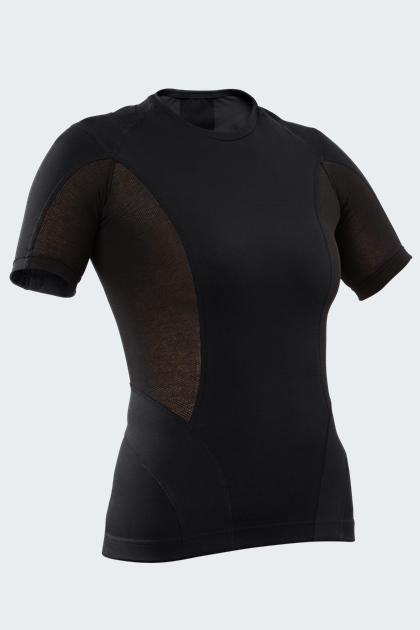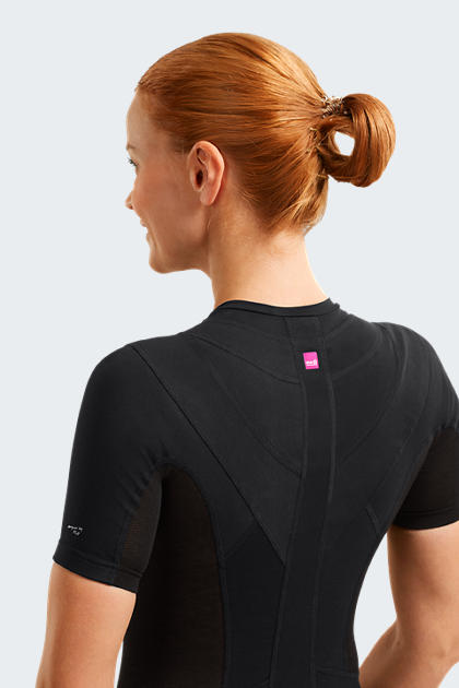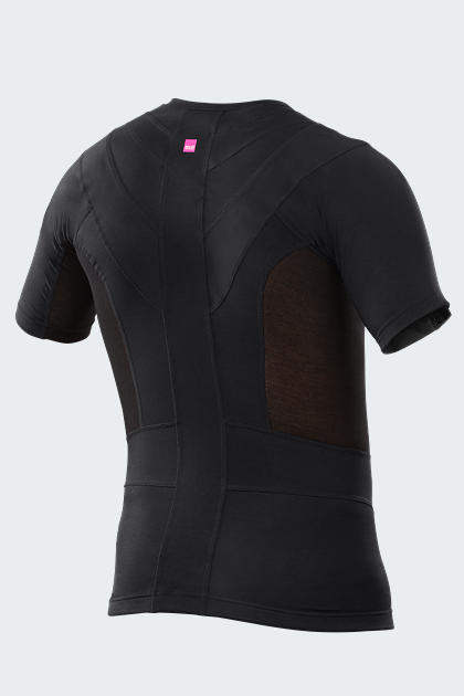 - Funkcjonalne elementy: Koszulka zawiera nieelastyczne panele oraz panele silikonowe w okolicy ramion i górnej części pleców, generujące napięcie mięśni obręczy barkowej, co stabilizuje mięśnie okołołopatkowe.