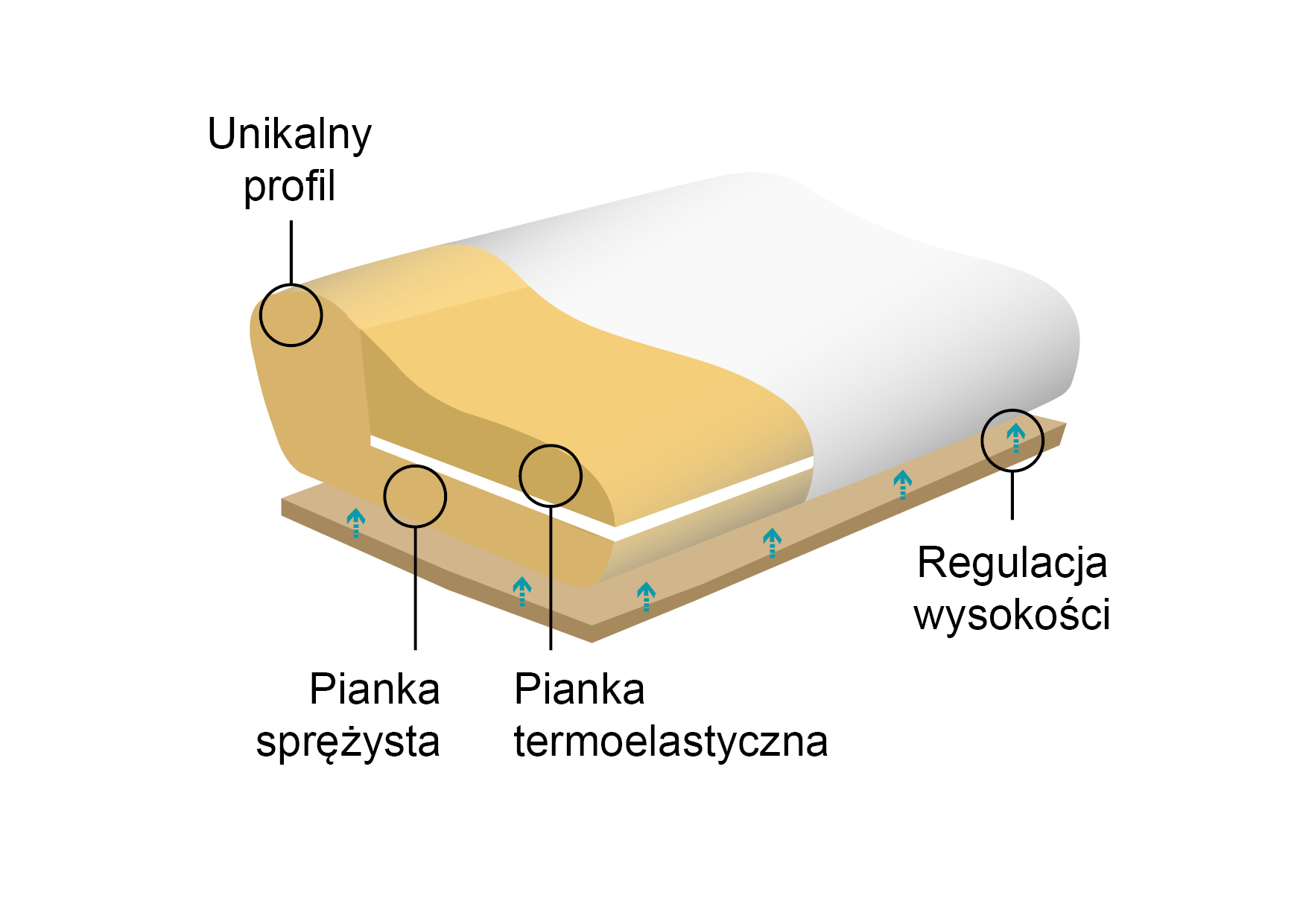 Zapewnia odpowiednie podparcie i prawidłową pozycję odcinka szyjnego kręgosłupa oraz głowy podczas snu. Poduszka została wykonana z połączenia pianki sprężystej i pianki termoelastycznej („z pamięcią”). Pianka sprężysta zapewnia dobre podparcie kręgosłupa szyjnego. Jest ona szczególnie zalecana przez lekarzy przy dolegliwościach, wynikających z nieprawidłowej pozycji podczas snu oraz zwyrodnień kręgów szyjnych. Dzięki zastosowaniu pianki termoelastycznej („z pamięcią”) poduszka doskonale dopasowuje się do ciała pod wpływem jego ciężaru i temperatury. Nie powoduje zbędnego nacisku mogącego prowadzić do odgnieceń. Doskonałe rozwiązanie dla osób śpiących na boku, chcących zachować pewne podparcie głowy i szyi przy jednoczesnym zachowaniu dużego komfortu snu.