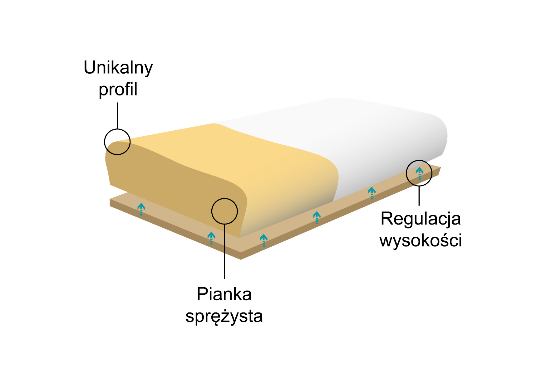 Dodatkowo poduszka posiada regulację wysokości. Jeśli poduszka jest za niska wystarczy włożyć podkładkę podwyższającą z pianki. Poduszka umożliwia spanie na plecach i na boku oraz indywidualne dopasowanie jej do budowy ciała.