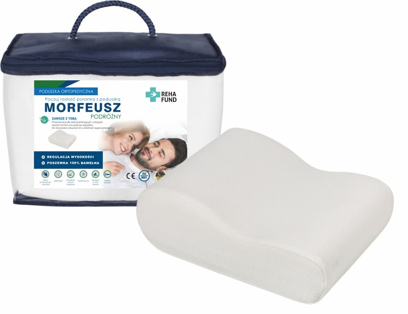 Poduszka ortopedyczna Morfeusz Podróżny zapewnia odpowiednie podparcie i prawidłową pozycję odcinka szyjnego kręgosłupa oraz głowy podczas snu. Dzięki zastosowaniu pianki termoelastycznej („z pamięcią”) poduszka doskonale dopasowuje się do ciała pod wpływem jego ciężaru i temperatury. Nie powoduje zbędnego nacisku mogącego prowadzić do odgnieceń, co daje poczucie wyjątkowego komfortu. Dodatkowo poduszka posiada regulację wysokości. Jeśli poduszka jest za niska wystarczy włożyć podkładkę podwyższającą z pianki. Poduszka umożliwia spanie na plecach lub na boku oraz pozwala na indywidualne dopasowanie jej do budowy ciała.