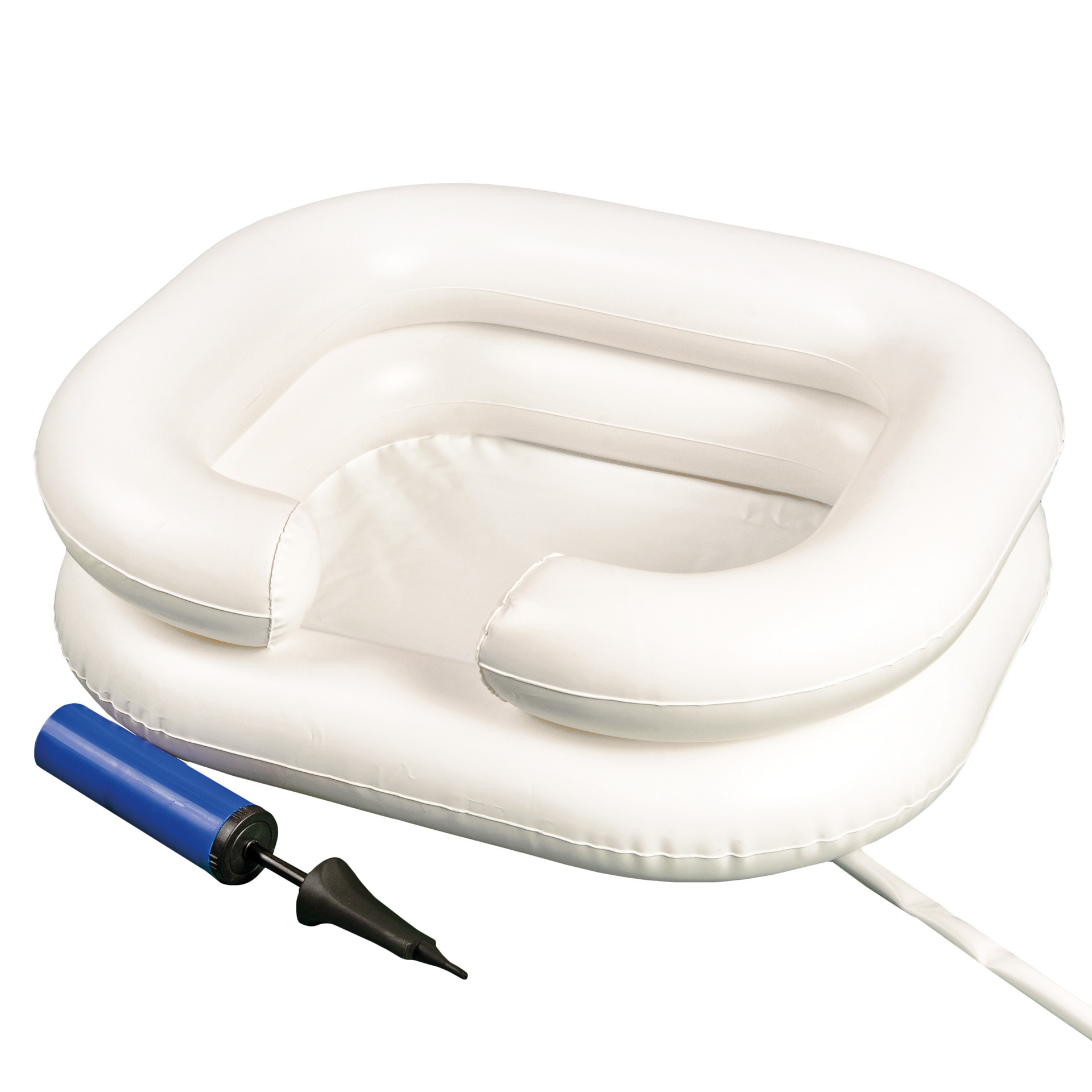 Pneumatyczna miska przeznaczona do mycia głowy osobom stale leżącym, stosowana w codziennym użytku przy opiece nad osobami unieruchomionymi, starszymi, z ograniczoną ruchomością stawów, niepełnosprawnymi.