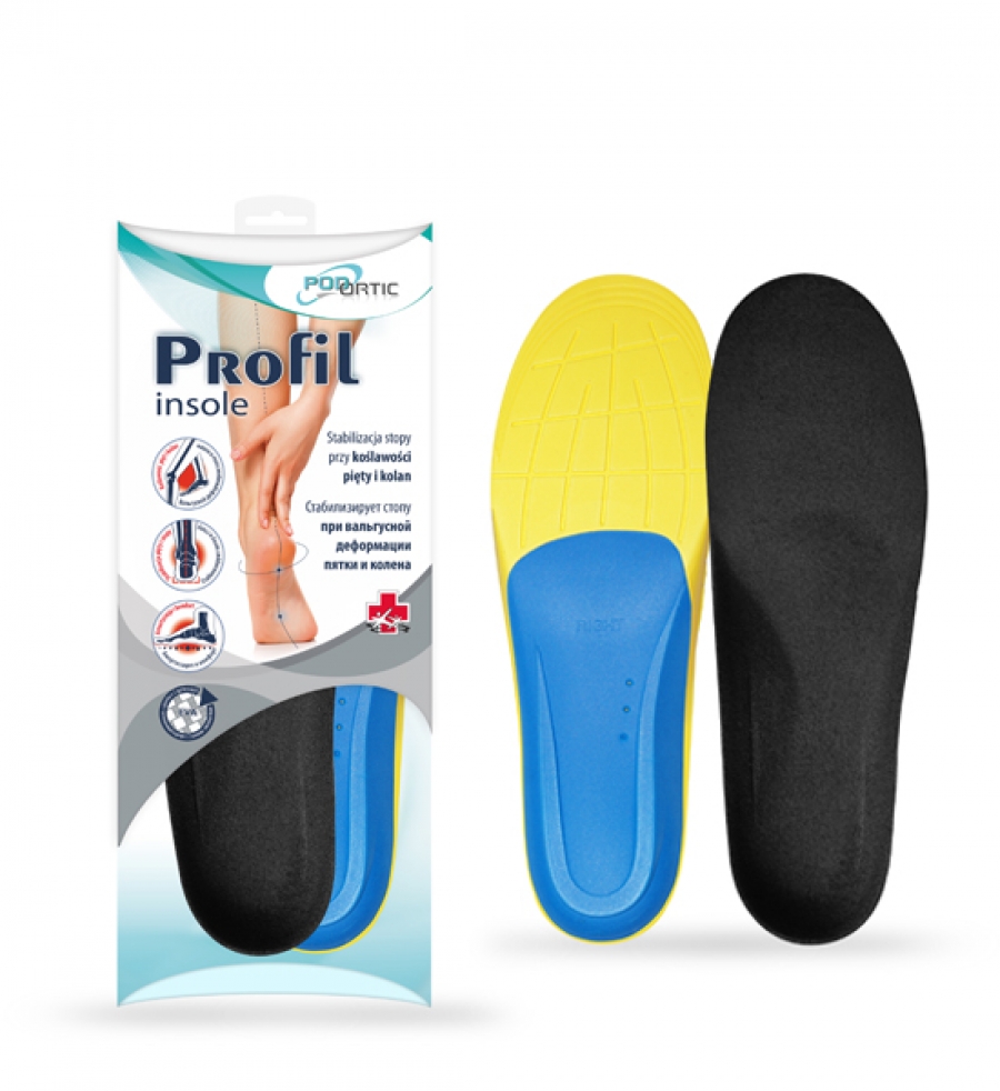 Ortopedyczne wkładki do butów – profilowane na koślawość pięt i kolan – Nowoczesne wkładki ortopedyczne Profil Insole to produkt medyczny polskiej firmy Corbby. Wykonane z dwóch warstw piankowych EVA o różnych gęstościach, pokryte materiałem welurowym. Dzięki głębokiemu korytku piętowemu skutecznie stabilizują piętę i utrzymują prawidłowe położenie stóp. Supinują piętę, chronią staw skokowy przed koślawieniem kostek oraz zapobiegają koślawości pięt i kolan. Prawidłowo ustawiają stopy płasko-koślawe.