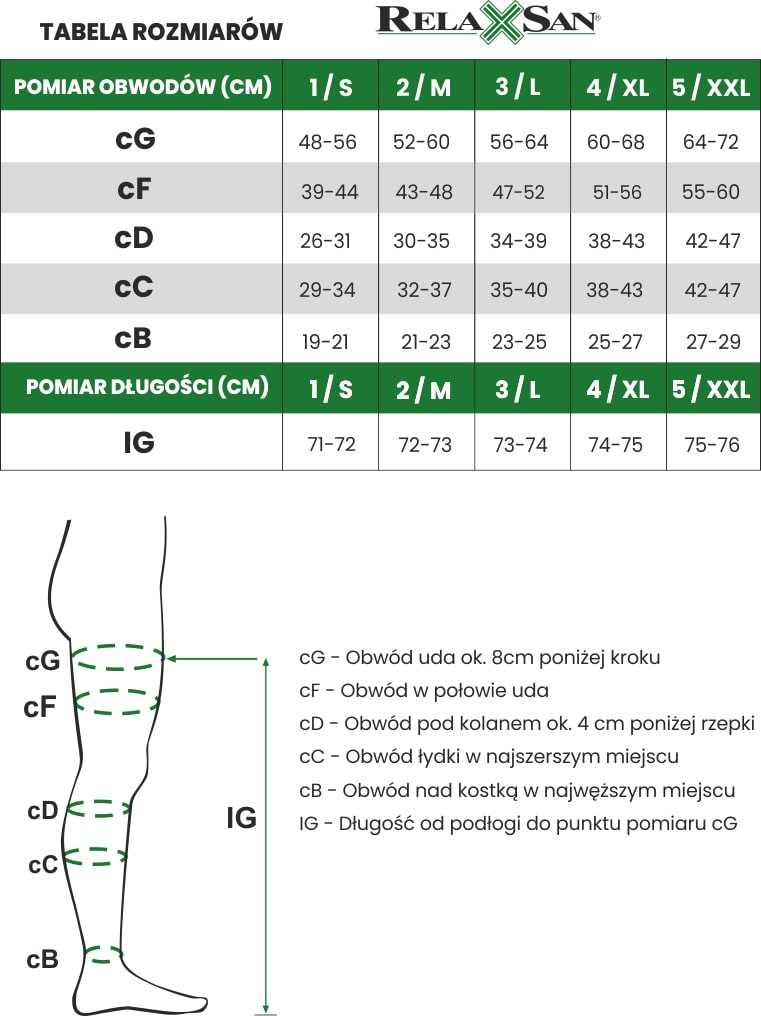 Rajstopy dostępne są w 5 rozmiarach. Należy dokonać pomiarów obwodów nogi oraz długości zgodnie z tabelą poniżej. Najlepiej zrobić to rano kiedy nogi są wypoczęte. Następnie odnaleźć pomiary w tabeli poniżej i przyporządkować do nich odpowiedni rozmiar od 1 do 5.